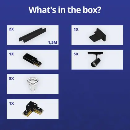 | Herstellername | Complete L shaped 1-Phase Track Set Black incl. 5x Spot fixture + GU10 2700K 3W Dim – 1,5 x 1,5 mete | |