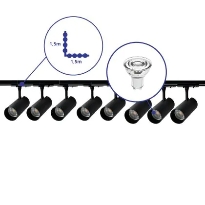 | Herstellername | Complete L shaped 1-Phase Track Set Black incl. 8x Spot fixture + GU10 2700K 3W Dim – 1,5 x 1,5 mete | |