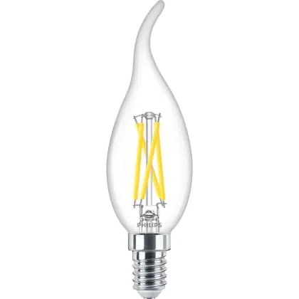 Die Mehrfachpackung 10x Philips MASTER LED E14 Gebogen-tip Kerze Fadenlampe Klar 2.5W 340lm - 922-927 Dim To Warm | Höchste Farbwiedergabe - Dimmbar - Ersatz Für 25W ist eine effiziente E14 LED-Lampe mit Retrodesign und der perfekte Ersatz für Ihre konventionellen 25W Lampen mit E14. Zudem strahlt sie Licht in der Farbtemperatur 2200K - 2700K Dim To Warm aus und punktet durch eine lange Lebensdauer.