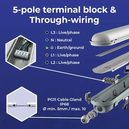 Die Mehrfachpackung 12x Noxion LED Feuchtraumleuchte Poseidon V3.0 18-30W 2340-4200lm - 830-865 CCT | 120cm - Durchgangsverdrahtung (5x2.5mm2) ist eine Feuchtraumleuchte. Sie strahlt Licht in der Farbtemperatur 3000K - 4000K - 6500K CCT aus und punktet durch eine lange Lebensdauer. Diese Leuchte ist speziell zur Verwendung in Feuchträumen (Keller, Waschräume, etc.) vorgesehen.