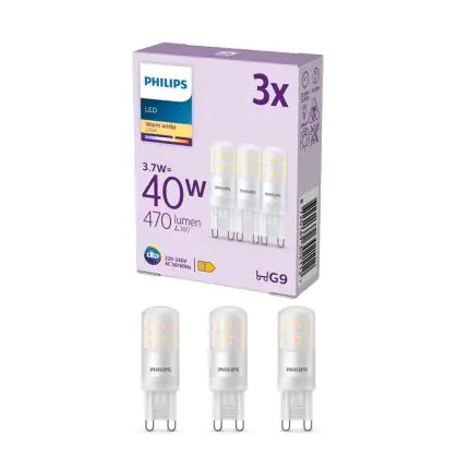 Die Mehrfachpackung 3x Philips LED Capsule G9 Matt 3.7W 470lm - 827 Extra Warmweiß ist eine effiziente G9 LED-Lampe und der perfekte Ersatz für Ihre konventionelle Halogenlampe mit W und einem G9-Sockel. Die Stifte haben einen Abstand von 9 mm. Zudem strahlt das Produkt Licht in der Farbtemperatur 2700K - Extra Warmweiß aus und punktet durch eine lange Lebensdauer.