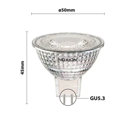 Die Noxion LED-Spot GU5.3 MR16 3.4W 345lm 36D - 840 Kaltweiß | Ersatz für 35W ist eine effiziente GU5.3 LED-Lampe. Das Produkt der Marke Noxion ist der perfekte Ersatz für Ihre konventionelle Halogenlampe mit 35W und einem GU5.3-Sockel, bei dem die beiden Stifte einen Abstand von 5,3 mm zueinander haben. Die Abkürzung MR16 zeigt Ihnen, dass der Reflektor einen Durchmesser von 5 cm hat. Zudem strahlt das Produkt Licht in der Farbtemperatur 4000K - Kaltweiß aus und punktet durch eine lange Lebensdauer.