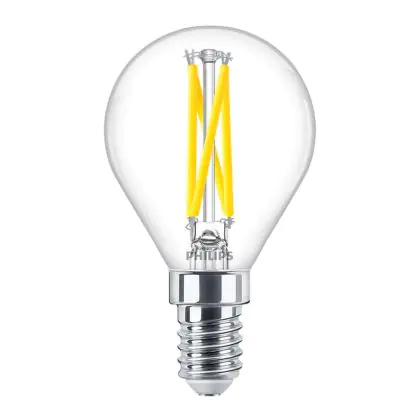 Die Philips MASTER LED E14 Kugel Fadenlampe Klar 2.5W 340lm - 922-927 Dim To Warm | Höchste Farbwiedergabe - Dimmbar - Ersatz Für 25W ist eine effiziente E14 LED-Lampe mit Retrodesign und der perfekte Ersatz für Ihre konventionellen 25W Lampen mit E14. Zudem strahlt sie Licht in der Farbtemperatur 2200K - 2700K Dim To Warm aus und punktet durch eine lange Lebensdauer.