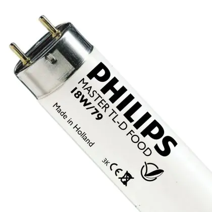 Philips TL-D Food sind Leuchtstoffröhren mit einem Durchmesser von 26mm. Diese Röhre sind besonders für die Beleuchtung von Lebensmitteln geeignet, da sie beispielsweise die Ansehnlichkeit von Fleischprodukten verbessern können. Die Philips TL-D Food 18W 79 sind 59 cm groß und haben einen G13 Sockel.