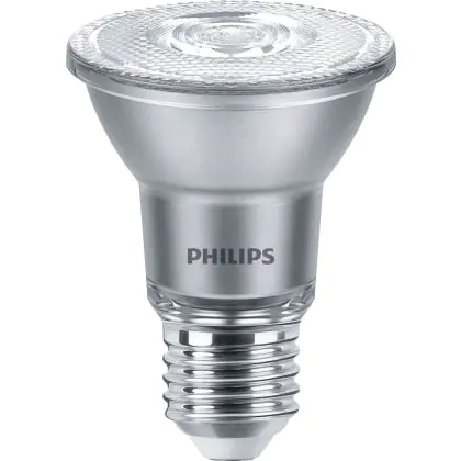 Der Philips Master Value LED Glühbirne Reflektor E27 PAR20 6W 515lm 25D - 930 Warmweiß | Höchste Farbwiedergabe - Dimmbar - Ersatz für 50W ist ein leistungsstarker LED-Strahler mit E27-Sockel. Er kommt mit einer hohen Lebensdauer von 25000 Stunden daher und spart Ihnen somit nicht nur Energie-, sondern auch Austausch- und Wartungskosten. Im Preis ist zudem eine All-In-Garantie von 5 Jahre enthalten.